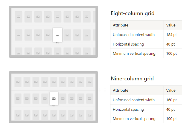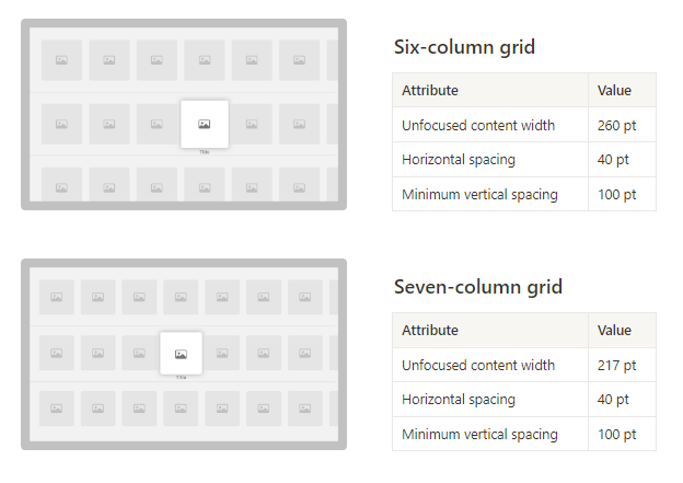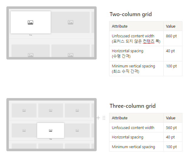 UIKit의 collection view 플로우 요소를 사용하면 그리드의 열 수는 컨텐츠의 너비와 간격에 따라 자동으로 결정됩니다. 자세한 개발자 지침은 UICollectionViewFlowLayout를 참조하세요.