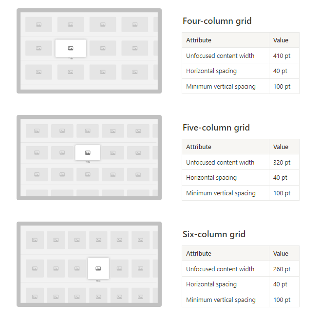 The following grid layouts provide an optimal viewing experience. Be sure to use appropriate spacing between unfocused rows and columns to prevent overlap when an item is brought into focus.