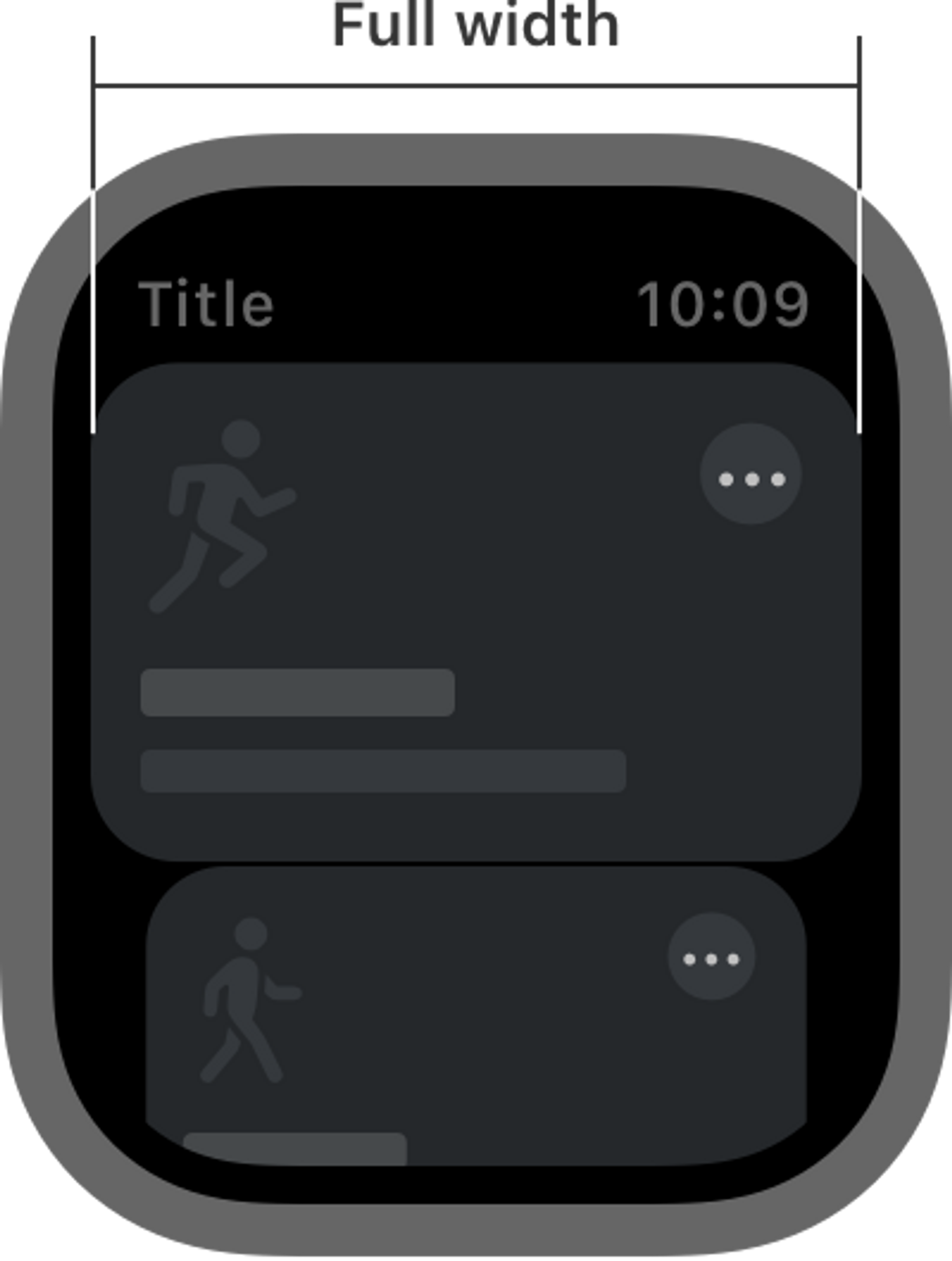 컨텐츠를 화면의 한 가장자리에서 다른 가장자리까지 확장하도록 디자인해야 합니다. Apple Watch의 베젤은 컨텐츠 주변에 자연스러운 시각적인 여백을 제공합니다. 가치있는 공간을 낭비하지 않기 위해 요소 사이의 여백을 최소화하는 것을 고려해 보세요. 이렇게 하면 더 많은 컨텐츠를 화면에 효과적으로 배치할 수 있고, 사용자에게 더 많은 정보를 제공할 수 있습니다.
