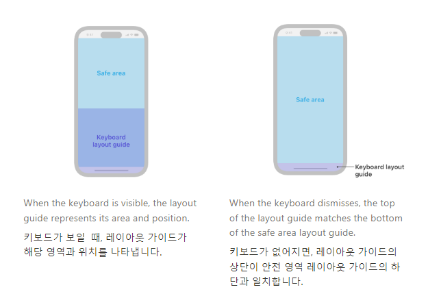 iOS 15 이상에서는 키보드가 현재 차지하는 공간과 안전 영역 인셋을 고려하는 키보드 레이아웃 가이드를 제공합니다. 이 가이드를 사용하면 사용자가 어떤 종류의 키보드를 사용하든 어디에 위치하든지 간에 키보드가 앱의 중요한 부분으로 느껴지도록 도움을 줄 수 있습니다. 개발자 지침은 UIKeyboard 레이아웃 가이드를 참조하십시오.