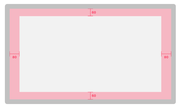 Adhere to the screen’s safe zone. Inset primary content 60 pixels from the top and bottom of the screen, and 80 pixels from the sides. It can be difficult for people to see content that close to the edges, and unintended cropping can occur due to overscanning on older TVs. Allow only partially displayed offscreen content and elements that deliberately flow offscreen to appear outside this zone.