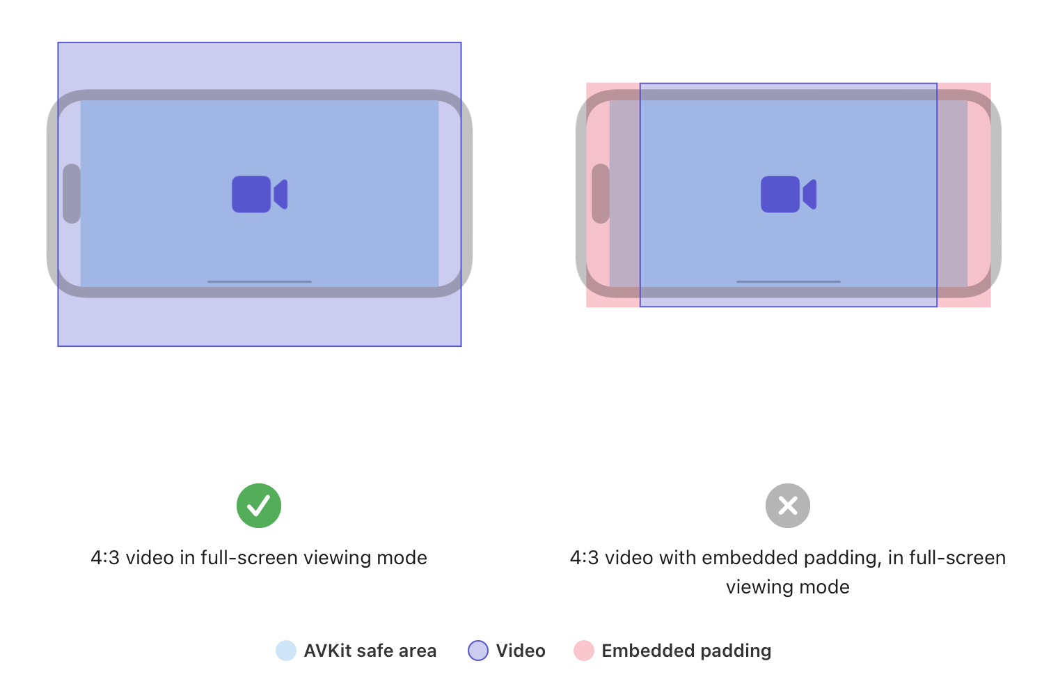 Always display video content at its original aspect ratio. When video content uses embedded letterbox or pillarbox padding to conform to a specific aspect ratio, the system may be unable to correctly scale the video based on the current playback mode. Padding embedded within the video frame can cause videos to appear smaller in both full-screen and fit-to-screen modes. It also prevents videos from displaying correctly in edge-to-edge, non-full-screen contexts, like Picture in Picture mode on iPad.